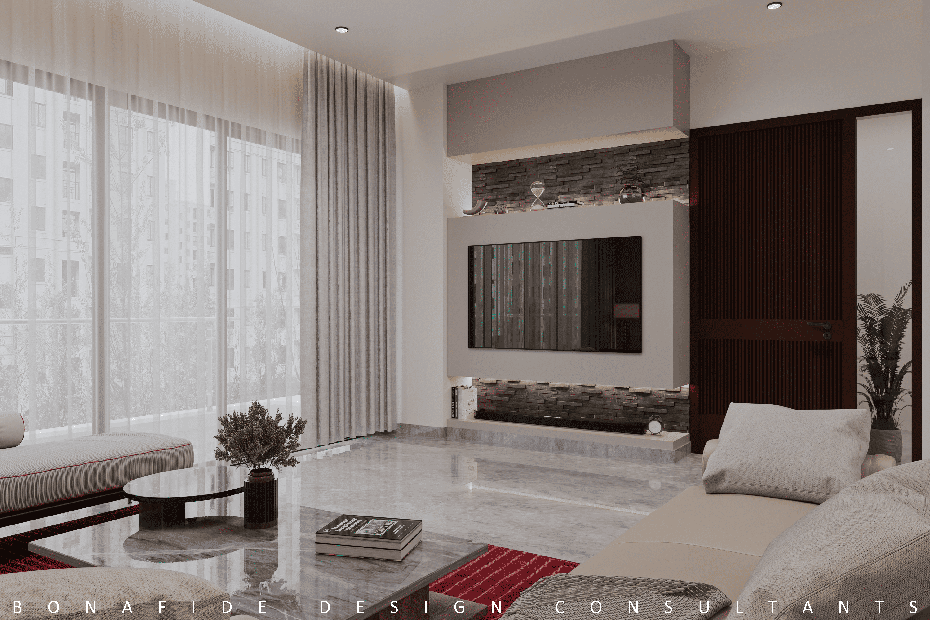 The Mundra Residence showcases contemporary interior design, blending luxury and functionality with clean lines, neutral tones, and bespoke furnishings. Thoughtfully curated materials and subtle textures enhance the modern aesthetic, creating a sophisticated yet inviting ambiance. With an emphasis on natural light and open spaces, the design offers timeless elegance and comfort.